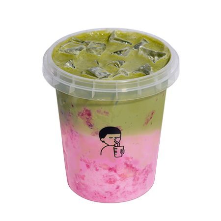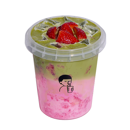 버켓에 신선한 생딸기와 제주산 말차크림이 어우러져 딸기와 말차 맛을 동시에 즐길 수 있는 버켓라떼